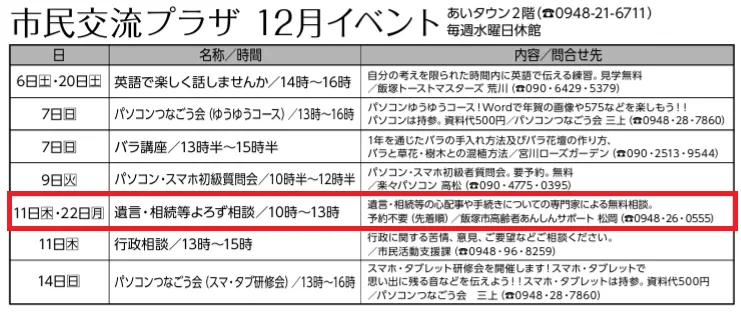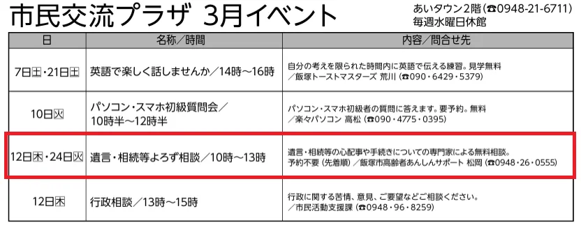 今月の「遺言・相続等よろず相談会」
